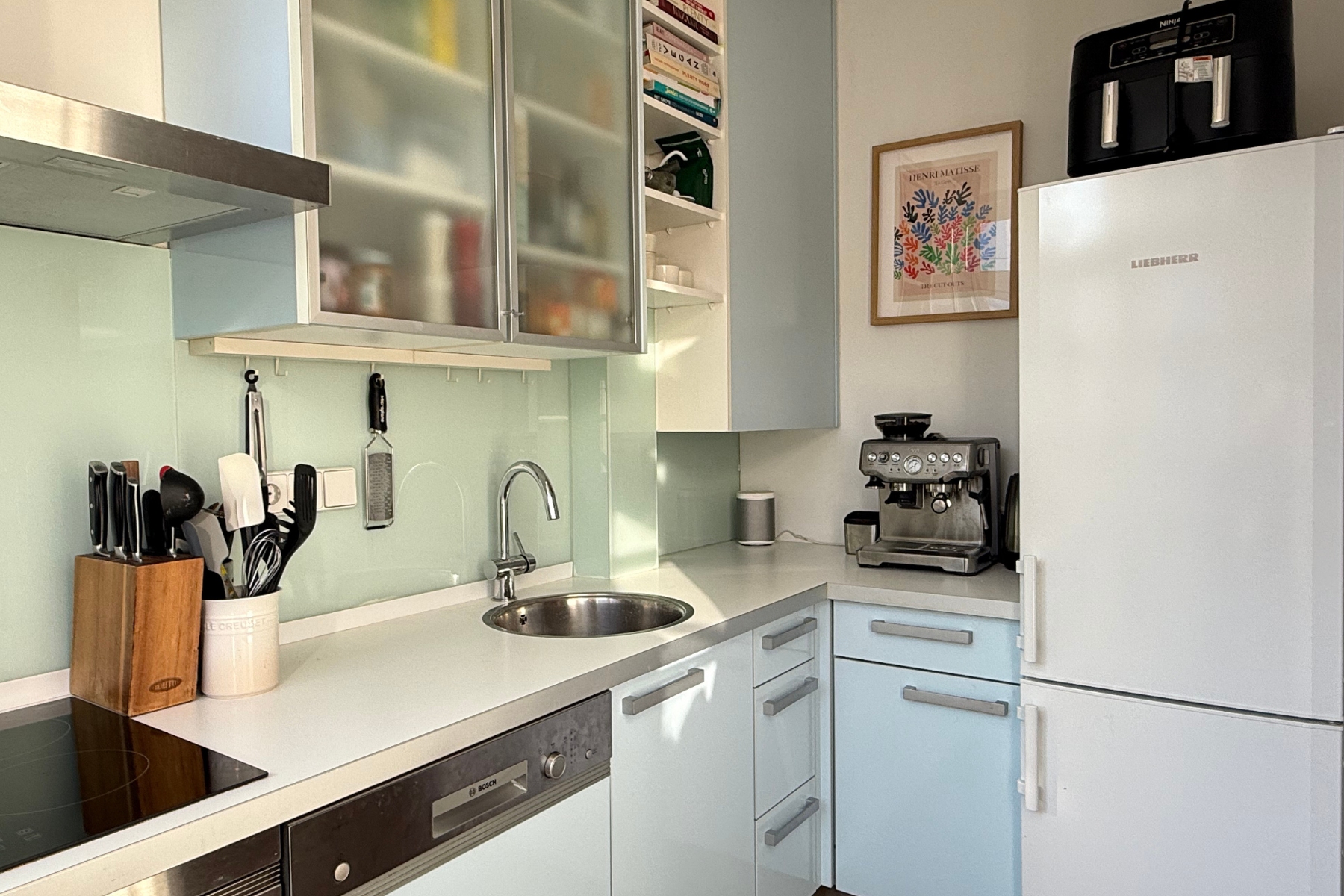 Adjacent to the dining area is the fully equipped kitchen, complete with appliances, a large sunny window, and direct access to the balcony. The dining room features double doors that open directly onto the balcony, allowing plenty of natural light and easy access to outdoor space.