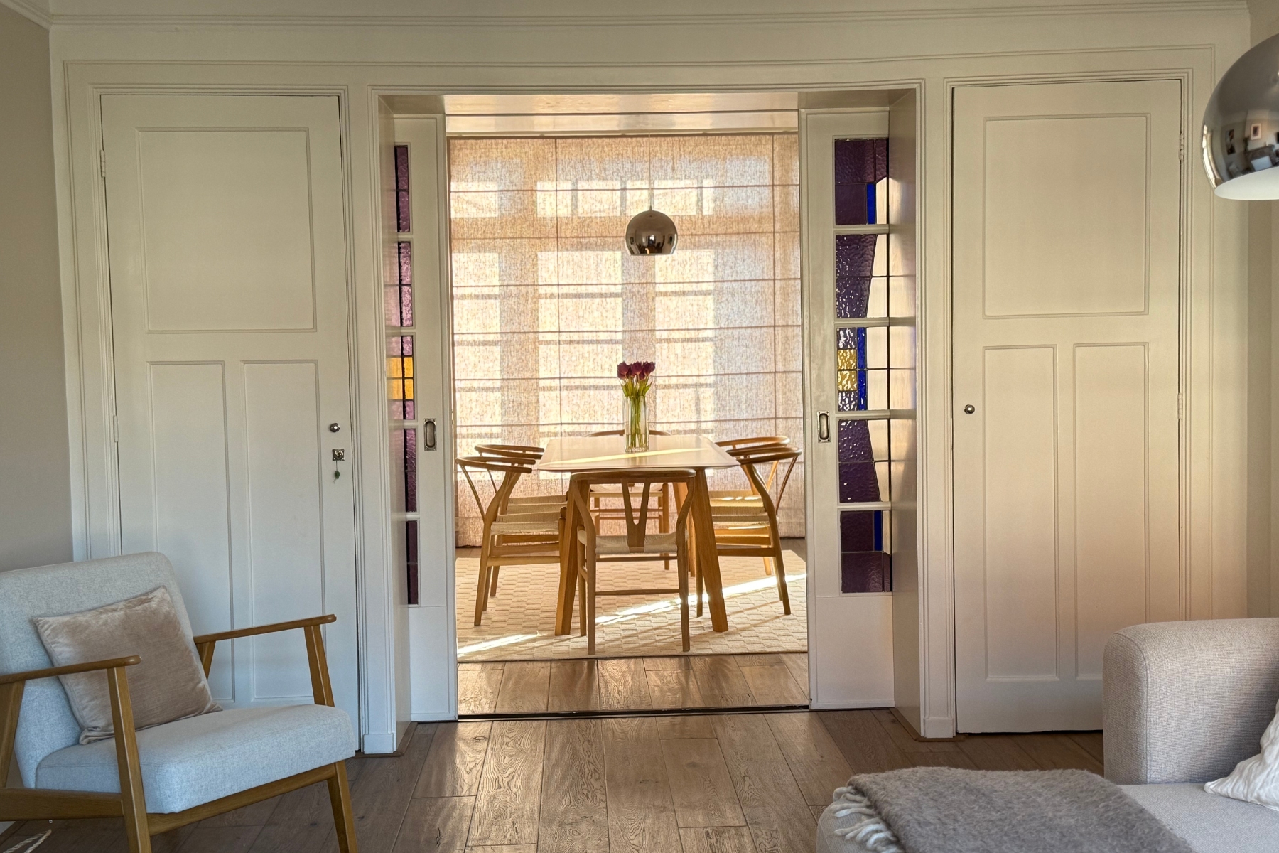 Upon entering the property, you are welcomed by a hallway that provides access to all areas of the home. The first level features a spacious and light-filled living area, with the living room and dining room separated by beautiful stained-glass French doors. The space is modernly furnished.