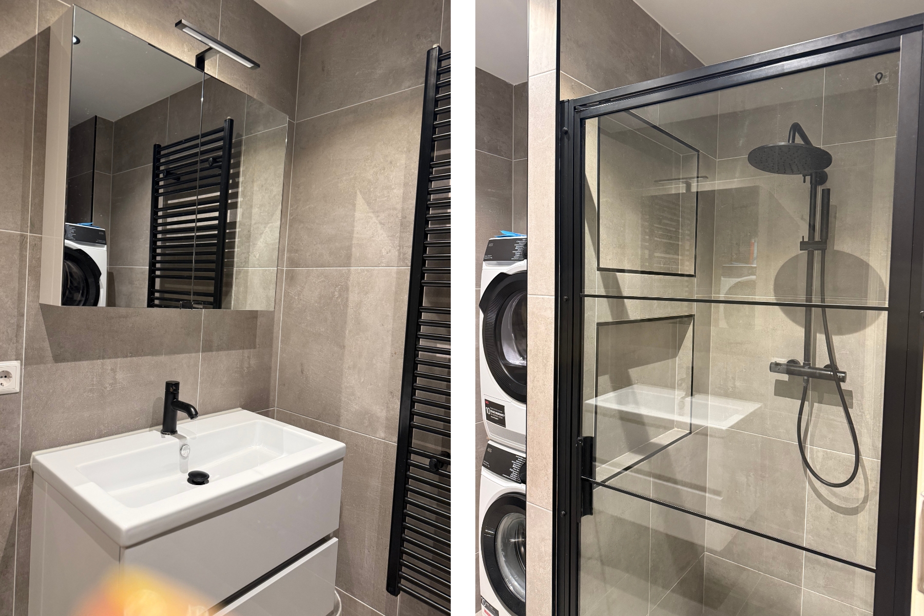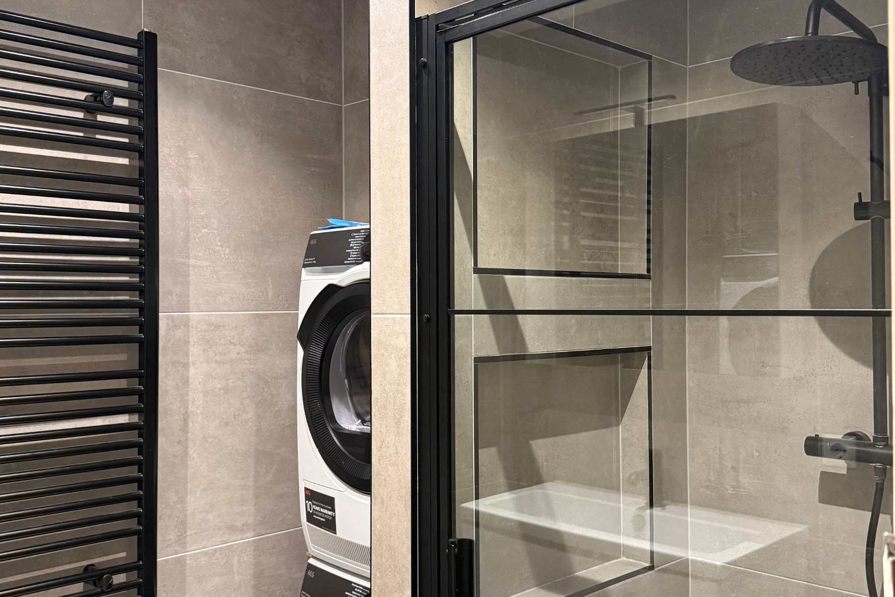 On this floor, you will also find the first bedroom, suitable for use as a bedroom or home office. The modern bathroom is fitted with a walk-in shower, and the apartment includes a new washing machine and a separate dryer. A separate toilet is also located on this level.